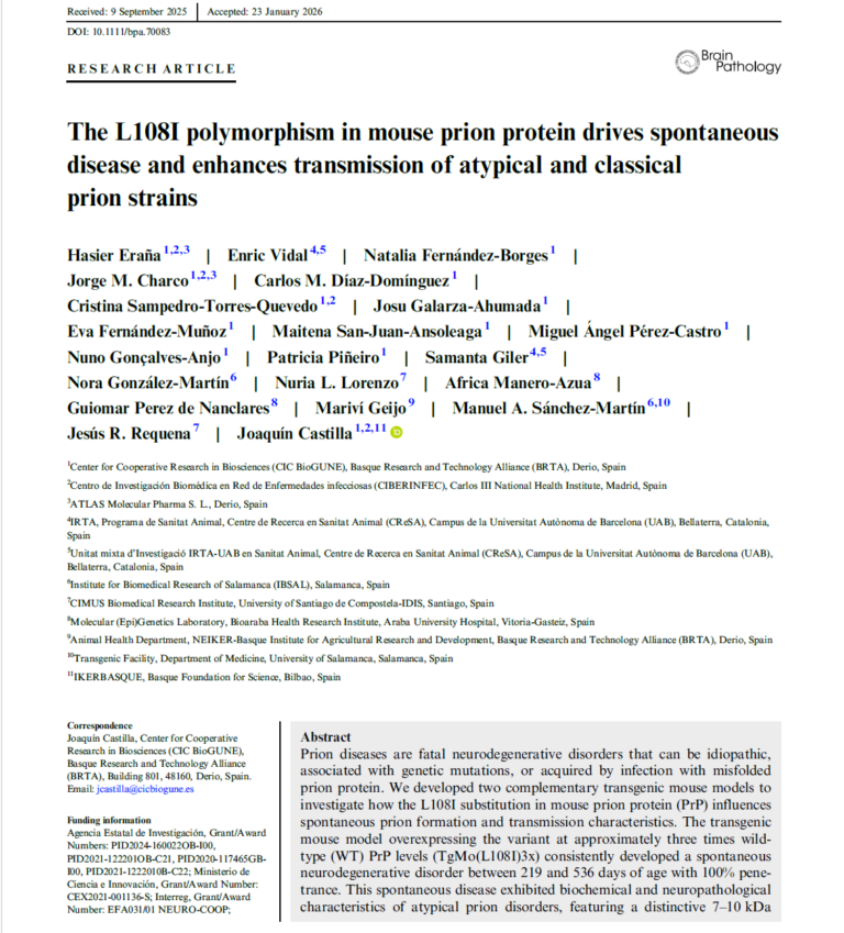 The L108I polymorphism in mouse prion protein drives spontaneous disease and enhances transmission of atypical and classical prion strains Eraña H, Vidal E, Fernández-Borges N, Charco JM, Díaz-Domínguez CM, Sampedro-Torres-Quevedo