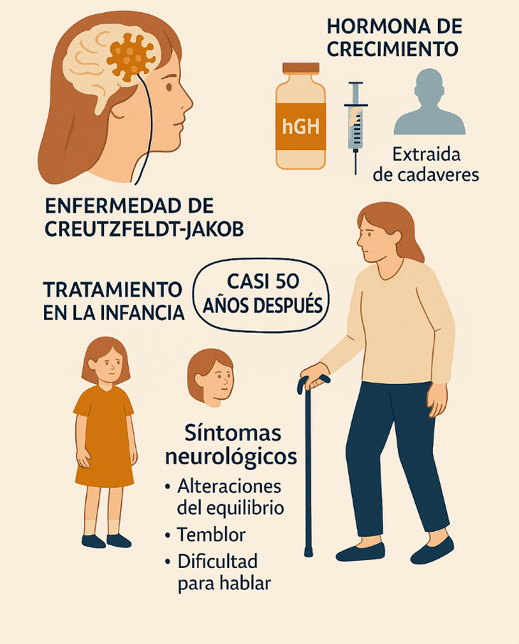 Un equipo de investigadores ha informado de un caso muy poco común: un caso de un paciente que desarrolló la enfermedad de Creutzfeldt-Jakob (ECJ) casi 48 años después de haber recibido tratamiento con hormona de crecimiento humana procedente de cadáveres durante su infancia. La ECJ es una enfermedad priónica, causada por proteínas anómalas llamadas priones, que dañan el cerebro y provocan síntomas neurológicos graves, como pérdida de equilibrio, temblores, dificultad para hablar y, finalmente, deterioro cognitivo acelerado.